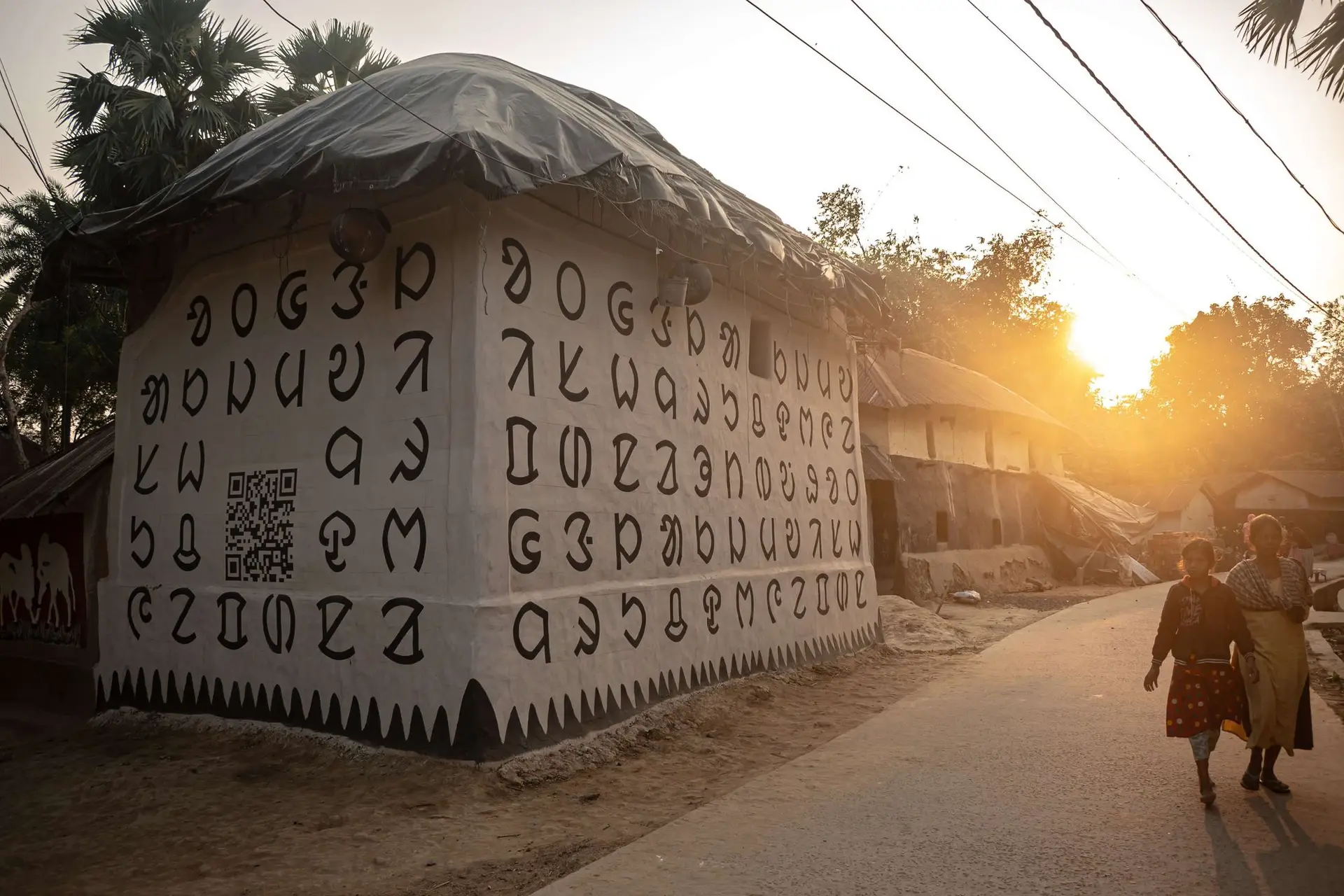 Mithu Sen, in collaboration with Sanyasi Lohar and his team, brings the Santali script into the landscape of a Santal village in a gesture that is both gentle and defiant. The work is not only a mural on mud walls; it is a reclamation, a reassertion of cultural identity in a world where linguistic invisibility has become a silent form of erasure. The mural draws from a heritage that recalls Santiniketan’s approach to art as public, communitarian, and transformative. It echoes this tradition but speaks in a distinct and deeply personal voice. It is composed of Ol Chiki script, the written form of the Santali language developed by Raghunath Murmu, filling the village walls with symbols that are at once familiar and subversive. It asks viewers to reflect on the quiet violences that erasure enacts on languages and cultures, the generations of forgetting that shape identities in the shadows.