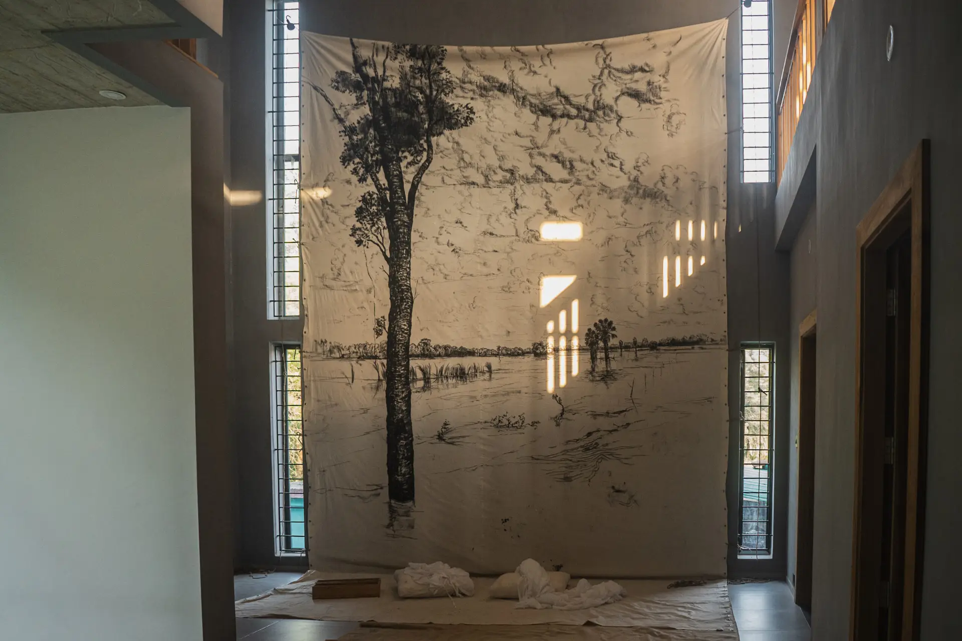 His ‘When Land Becomes Water’ is a 10-hour live performance that blurs the boundaries between art and ecology, inspired by a profoundly altered landscape in Santiniketan. The performance unfolds at Gabaa’s artist-run residency space, where dressed in an austere white costume designed by Alex Alphonse, Chopra will transform the physical act of drawing into a meditation on fragility and change using burnt wood and the black dust it produces.